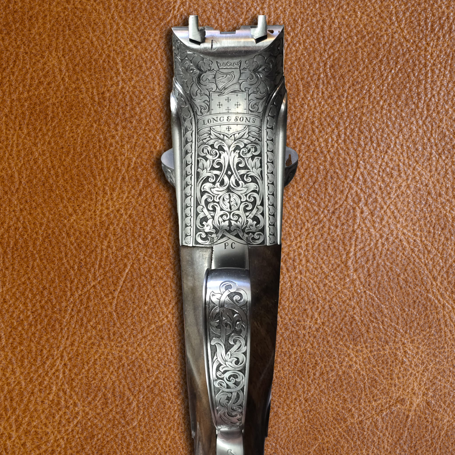 The quarter rib features elegant leaf and scroll engraving with wedges of scrollwork extending from either breech. The barrels are fitted to the brushed bright finished Holland & Holland "serpentine" bolstered sidelock action with hidden third fastener. The clipped fences showcase a Persian leaf pattern with William Morris-inspired scroll engraving that flows across the barrels, surrounding Long & Sons signature banners and coat of arms, then continuing onto the top lever, trigger guard, and both tangs. This exceptional engraving was executed by legendary English Master Engraver William Wild, renowned for his extensive work at Holland & Holland and James Purdey & Sons.